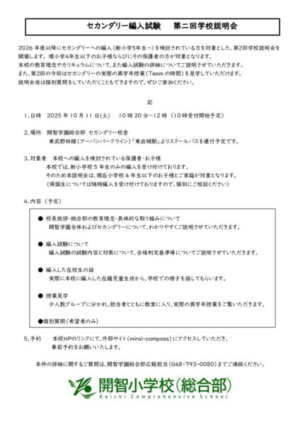 新着情報 開智小学校(総合部) > 20251011hennyusetsumeikai 新着情報 新着一覧 セカンダリー児童生徒ブログ 異学年(Team) 授業 探究 入試情報 行事 在校生の活躍 卒業生の声 その他 2025.11.04〜11.07 8年生地域探究フィールドワーク 総合部の最上級生である8年生は、探 2025.11.06.プライマリー秋のエクスカーション(芸術・科学) 11月6日(木)、プライマリー 2025.11.01 緊急時児童引き渡し訓練 11月1日(土)、非常災害時を想定した「緊急時児童引 2025.10.22〜10.24 3年生食の探究フィールドワーク 3年生は10月22日から2泊3日 【12月6日(土)第一回学校説明会(新1年生・編入生向け)のお知らせ】 2027年度以降(新1年生 2025.10.17〜10.18 1年生オータムスクール 1年生は10月17日から1泊2日で栃木県日 総合部Instagram 20251011hennyusetsumeikai 2025.09.02 2025.11.04〜11.07 8年生地域探究フィールドワーク 総合部の最上級生である8年生は、探 2025.11.06.プライマリー秋のエクスカーション(芸術・科学) 11月6日(木)、プライマリー 2025.11.01 緊急時児童引き渡し訓練 11月1日(土)、非常災害時を想定した「緊急時児童引 2025.10.22〜10.24 3年生食の探究フィールドワーク 3年生は10月22日から2泊3日 【12月6日(土)第一回学校説明会(新1年生・編入生向け)のお知らせ】 2027年度以降(新1年生 2025.10.17〜10.18 1年生オータムスクール 1年生は10月17日から1泊2日で栃木県日 総合部Instagram