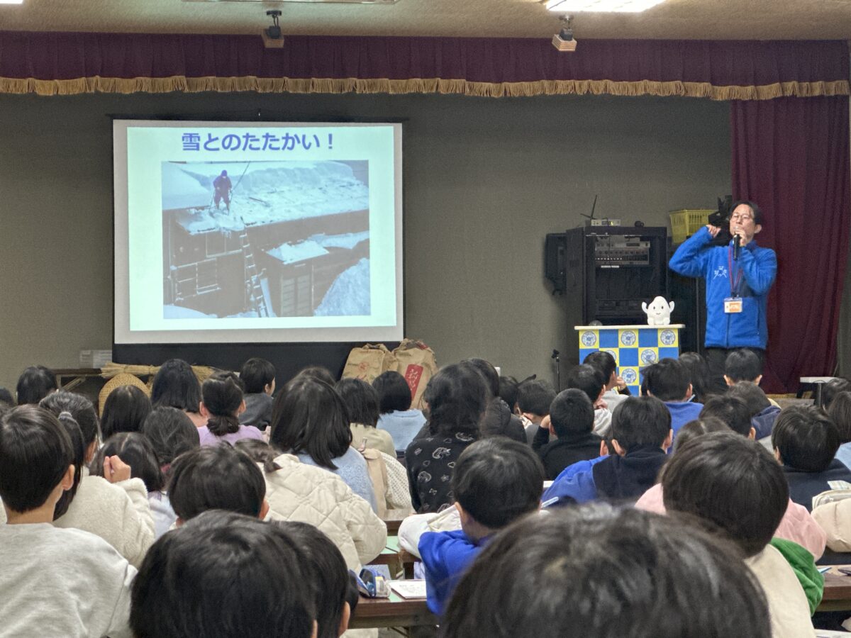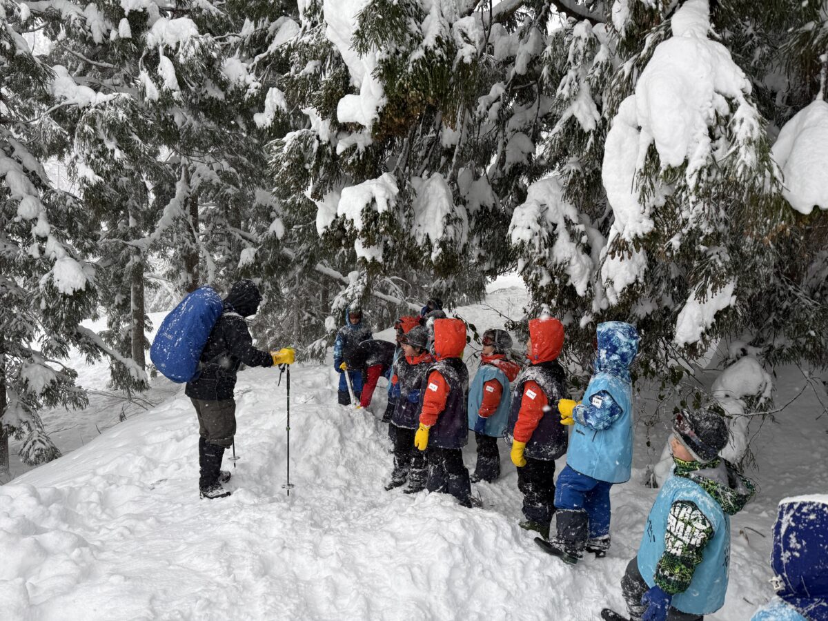1日目の午後は、雪慣れも兼ねて、外での基本的な雪遊びを体験しました。この日は、大雪の予報が出ていて、降雪と風の中での活動でしたが、子どもたちは、この冬、初めての雪を体感した人が多く、しかも新雪だったので、大きな声を上げながら、足全体が雪にはまりながらも、笑顔でおにごっこをしたり、そり遊びをしたりと、楽しい時間となりました。その後、現地のガイドさんにお世話になり、雪の森の中での探究活動にも臨みました。また、夕方は、魚沼市の観光協会の方から、魚沼市の自然、文化、生活、特徴など、様々な話を伺い、埼玉県との違いなどについて、比較しながら考える良い機会となりました。