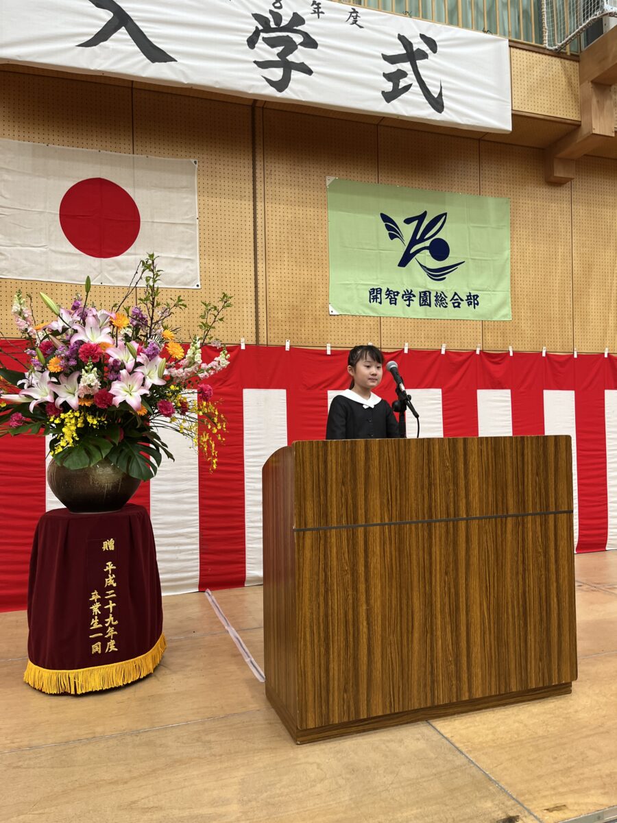 今年度は、123名の新入生を迎えての式となりました。開智小学校伝統の4年生と手をつないでの新入生の入場から、ドキドキワクワクの1年生全員の決意表明、在校生の元気な校歌の歌声が響く、心温まる式となりました。在校生代表の児童の歓迎の言葉を掲載します。