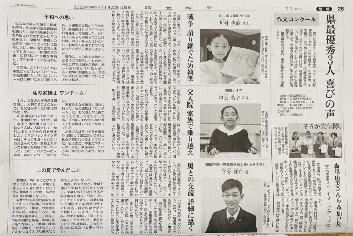 串上さんは、小学校高学年部門(小4~6年生対象:原稿用紙20枚以内)に、家族に関する作文を書いて応募して、今回、都道府県審査のトップで各部門1名だけが選ばれる「最優秀賞」を受賞しました。先日、主催の読売新聞社からの取材も受けて、作文の感想や受賞の喜び、将来の夢などについて、一生懸命、取材に答えていました。その記事が、『11月22日(土)の読売新聞朝刊の地域面(埼玉県)』に掲載されました(上記写真)また、コンクールは、これで終わりではなく、これから、全国大会にあたる中央審査に進むこととなりました。